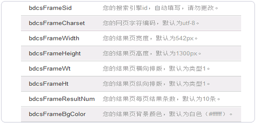 1、百度站内搜索嵌入式搜索代码中提供了参数自定义功能,结果页横向排版、结果页高度、网页字符编码、搜索结果页宽度等进行定义,参数说明如下: